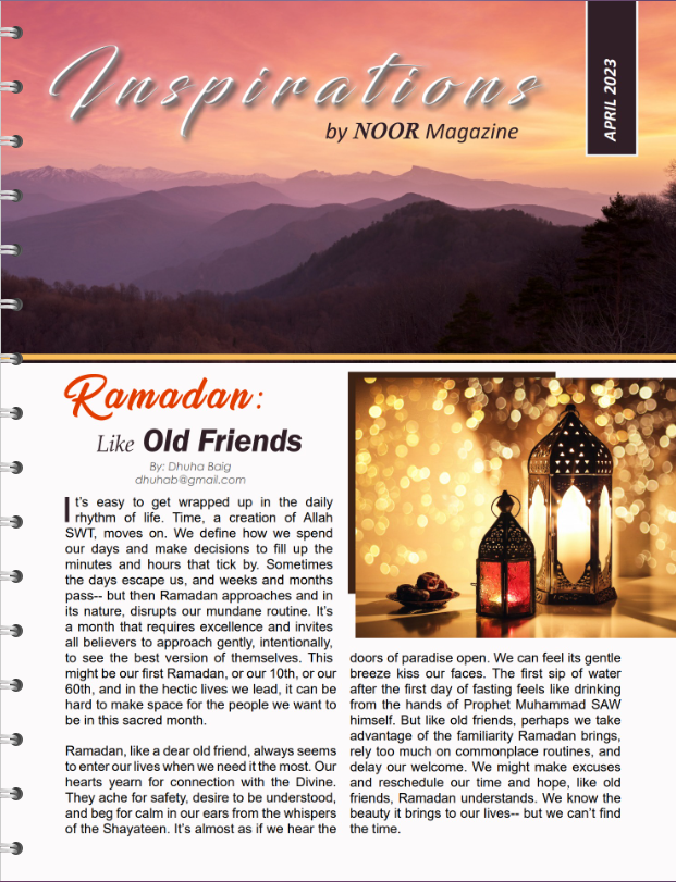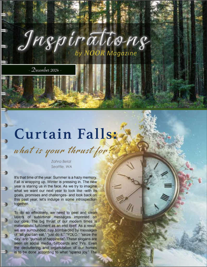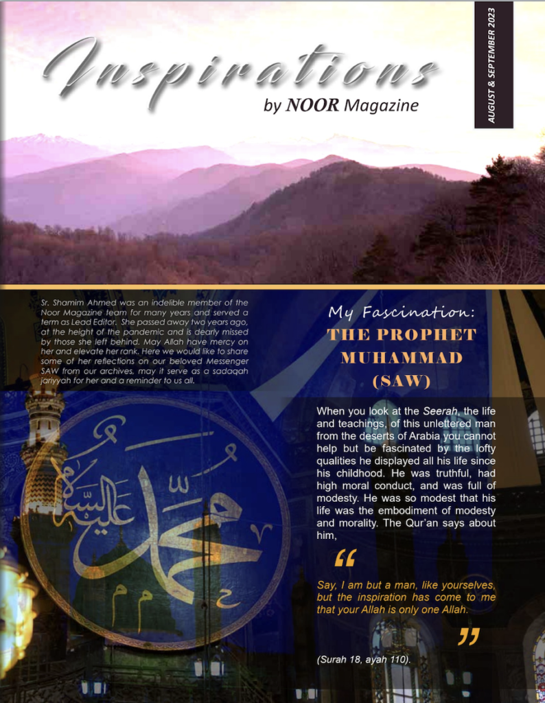 Noor magazine was established by ICNA Sisters with the aim of enabling Muslim women throughout North America to gain more knowledge of our deen . By the grace of Allah (swt), each year, we publish three issues both in English and in Urdu. We cover a variety of themes, focusing on issues relevant to our society and offering solutions for the betterment of humanity at large. An underlying theme of all our issues is the role of Muslims in this Non-Muslim society as a community that enjoins good and prevents evil.